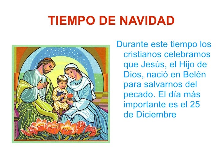 - Durante este tiempo los cristianos celebramos que Jesús, el Hijo de Dios, nació en Belén para salvarnos del pecado. El día más importante es el 25 de Diciembre. Su color es el blanco.