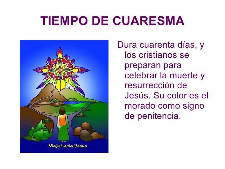 - Dura cuarenta días, y los cristianos se preparan para celebrar la muerte y resurrección de Jesús. Su color es el morado como signo de penitencia.